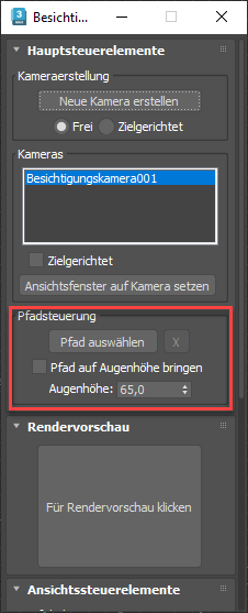 - Öffnen Sie den Besichtigungs-Assistenten. Vorgabe-Menü: Menü "Animation" > Besichtigungs-Assistent > Rollout "Erweiterte Steuerelemente". Alternatives Menü: Menü "Animation" > Hilfsmittel (Animationssatz) > Besichtigungs-Assistent > Rollout "Erweiterte Steuerelemente". Klicken Sie im Bereich "Pfadsteuerung" auf "Pfad auswählen" und dann auf den Pfad, den Sie erstellt haben. Die Kamera wird am erstellten Pfad gefangen.