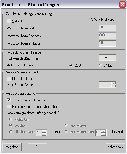 Im Dialogfeld "Erweiterte Einstellungen" können Sie Zeitüberschreitungen pro Auftrag festlegen, die TCP-Anschlussnummer zuweisen, Skripts vor dem Rendern angeben und die Auftragsverarbeitung sowie die Archiveinstellungen beeinflussen.