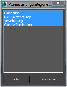 Jede Kategorie entspricht einer Registerkarte des Dialogfelds "Rendern einrichten". Wählen Sie aus, für welche Registerkarte Sie Einstellungen aus der RPS-Datei laden möchten, und klicken Sie auf "Laden". Nachdem Sie eine benutzerdefinierte Voreinstellungsdatei geladen haben, erscheint ihr Name zusätzlich zu den vorgegebenen Einstellungen in der Dropdown-Liste.