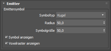 Mit dem Rollout Emitter können Sie Emitteroptionen für den ausgewählten Solver festlegen. Sie können diese Optionen auch im Fenster der Gruppe Erstellen/Ändern festlegen oder ändern.