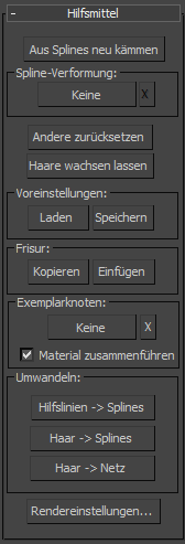 Dieses Rollout enthält Hilfsmittel, mit denen Sie eine Reihe von Aufgaben mit Haaren durchführen können. Beispielsweise können Sie ein vorhandenes Spline-Objekt zum Erstellen einer Frisur verwenden, Haare zurücksetzen oder bestimmte Frisuren und allgemeine Voreinstellungen für den Modifikator laden und speichern. Hier können Sie auch ein Objekt aus der aktuellen Szene angeben, das als Haar verwendet werden soll, zum Beispiel eine Blume oder eine Gruppe von Blumen zum Erstellen eines Gartens.