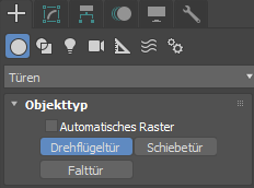 Erstellungsgruppe auf den Pfeil der Dropdown-Liste und wählen "Türen". Klicken Sie im Rollout Objekttyp, um "Drehflügeltür" zu aktivieren.