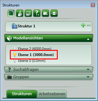 Neu erstellte Objekte werden auf der aktiven Ebene platziert. Sie können von einer Ebene zu einer anderen wechseln, indem Sie darauf doppelklicken. Aktive Ebenen werden auf der Registerkarte Strukturen des Projekt-Explorers in Fettschrift angezeigt.
