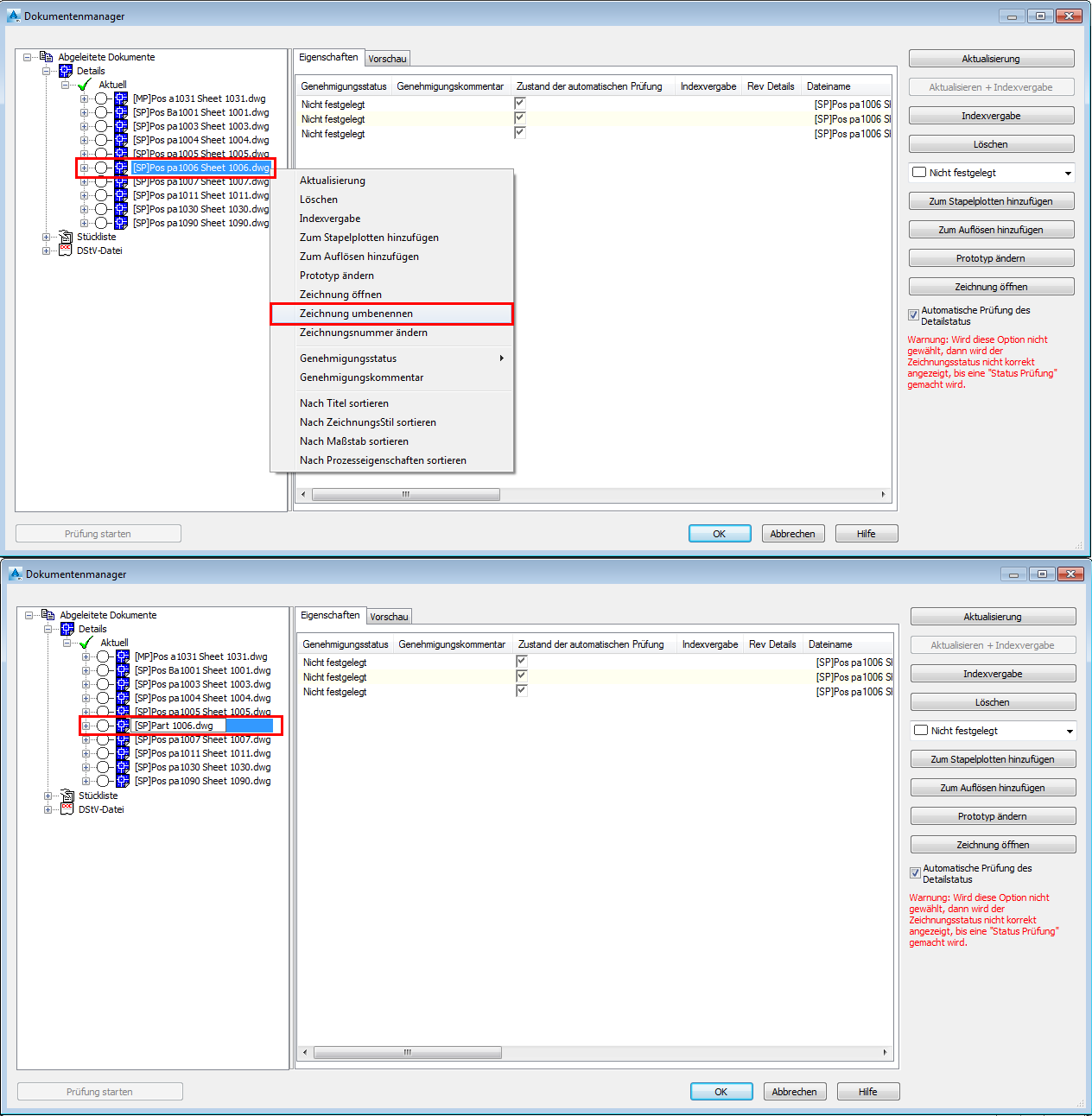 Sie können Zeichnungen direkt über den Dokumentenmanager aktualisieren. Darüber hinaus können Sie das Verhalten des Dokumentenmanagers für die Prüfung des Detailstatus steuern.