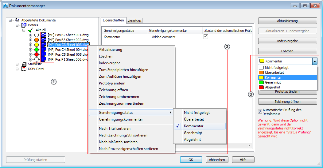 Der Genehmigungsstatus der Zeichnungen und die Kommentare werden auf der Registerkarte Eigenschaften des Dialogfelds angezeigt und Sie können die Liste der Zeichnungen nach Genehmigungsstatus oder Genehmigungskommentar sortieren.