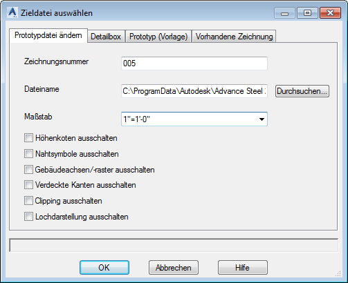 Anmerkung: Nach Vorgabe haben die Einstellungen in diesem Dialogfeld Werte, die aus den Vorgabeeinstellungen (z. B. Zeichnungsnummer, Prototyp) von Advance Steel oder aus der Zeichnungsstilkonfiguration (z. B. Maßstab) übernommen werden. Sobald sie angepasst wurden, werden die Einstellungen für die zukünftige Verwendung gespeichert.