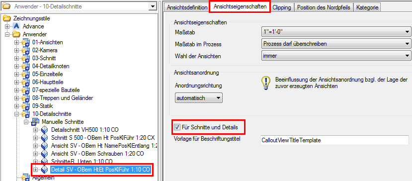 • Passen Sie das Detailausschnittsymbol und den Detailausschnitttitel über eine grafische Vorlage (ähnlich der Schweißnahtvorlage) anstelle einer Beschriftung an.