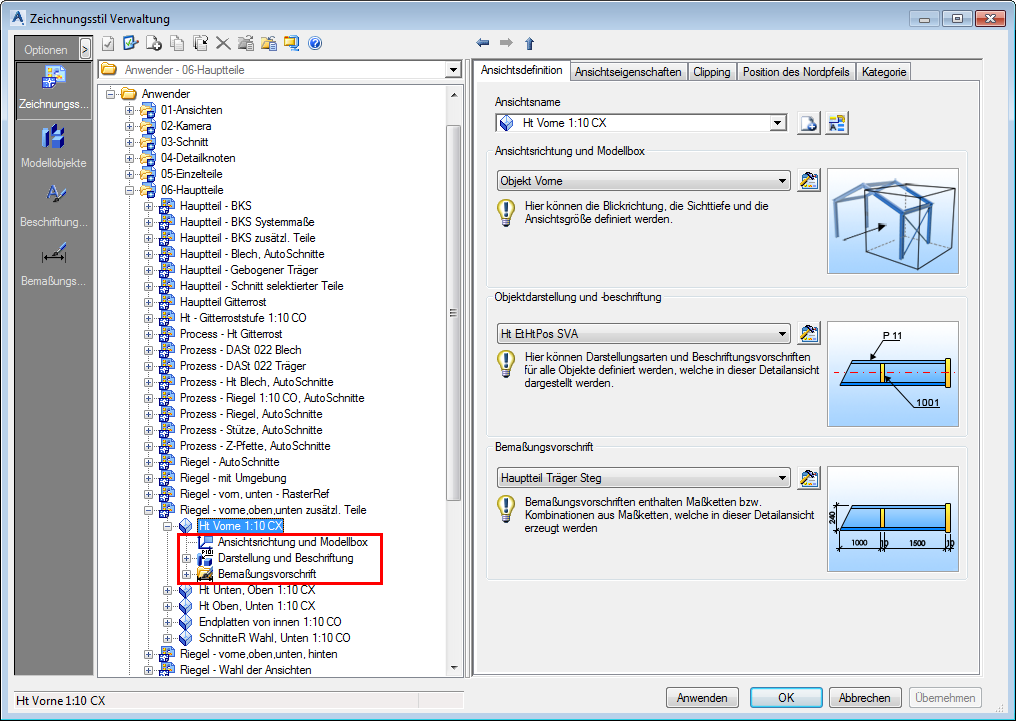 - Bemaßungsvorschrift: Bemaßungstypen, die in der Ansicht zu verwenden sind, und Einstellungen für die einzelnen Typen.