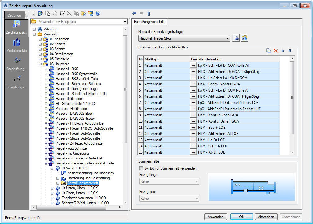 Alle in der ausgewählten Ansicht erstellten Maßketten werden in der Tabelle aufgelistet. Einstellungen für Summenmaße können zusammen mit den Einstellungen für die Maßketten angepasst werden.