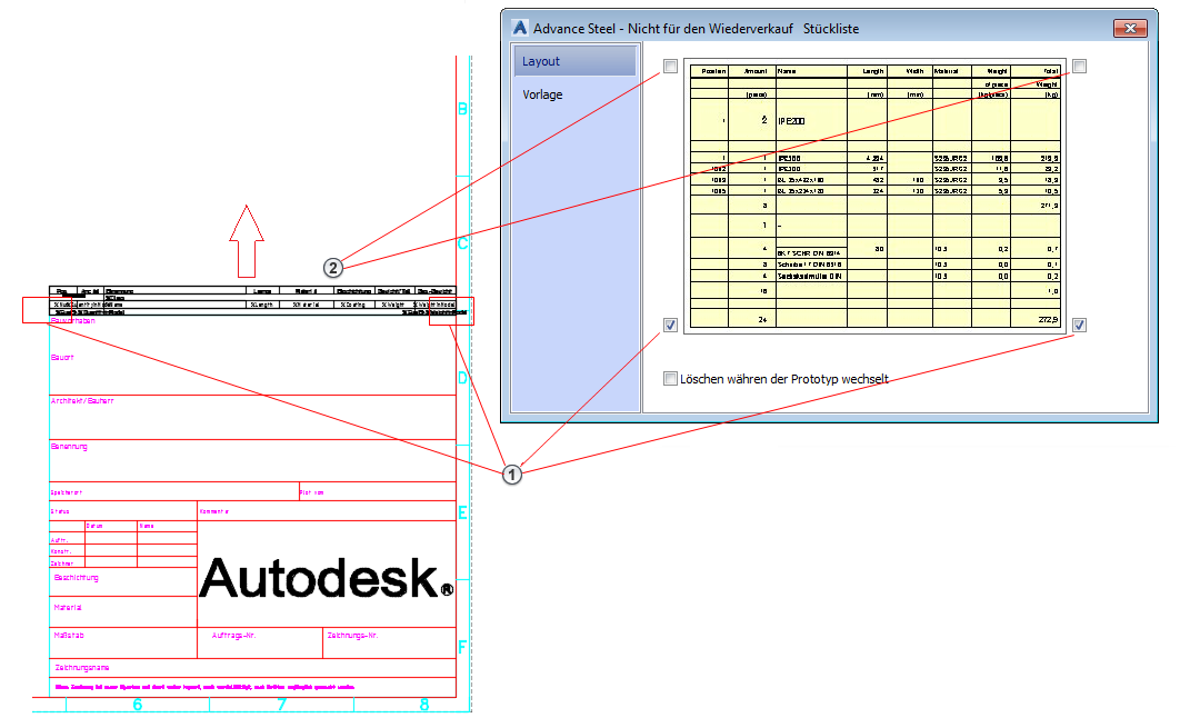 - Verwenden Sie die Kontrollkästchen auf der Registerkarte Layout des Dialogfelds Liste, das angezeigt wird, sobald die Stückliste auf der Vorlage für Zeichnungen eingegeben wurde, um die Listenposition in einer der Ecken des Rechtecks zu beheben. Die Stückliste auf der Zeichnungsgröße wird über diese Ecken gesteuert. Auch sich alle 4 Ecken sperren lassen, wird dies nicht empfohlen, da sonst die Skalierung der Liste erzwungen wird, um in das entsprechende Rechteck zu passen.