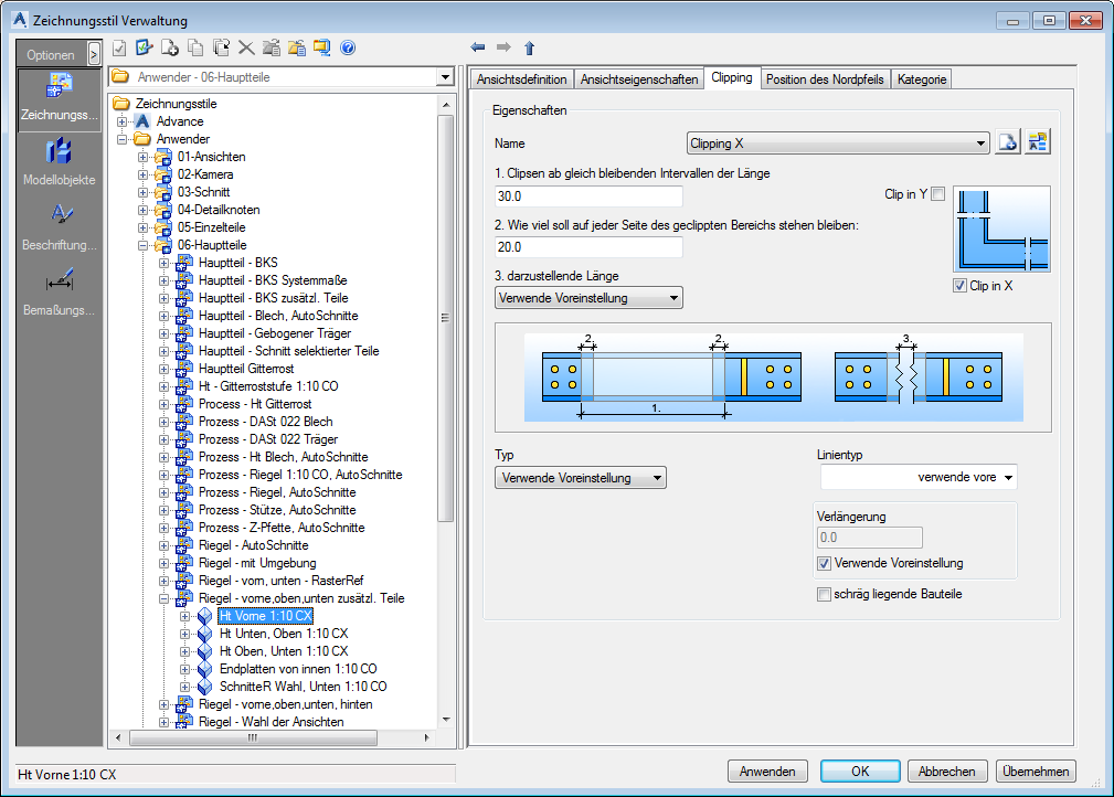 Optional kann das Clipping mit Verlängerungslinien dargestellt werden (Clipping-Linie ragt über das Element hinaus). Die Verlängerungsgröße der Linie kann festgelegt werden.