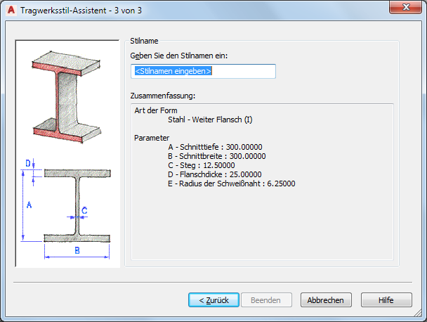 Gehen Sie wie folgt vor, um einen Tragwerksstil über den Tragwerksstil-Assistenten zu erstellen. Sie können innerhalb des Stils eine Tragwerksform erstellen, die auf eine der 19 verschiedenen Formen im Tragwerkskatalog basiert. Die aktuellen Zeichnungseinheiten legen die Einheiten des Stils fest, den Sie erstellen.