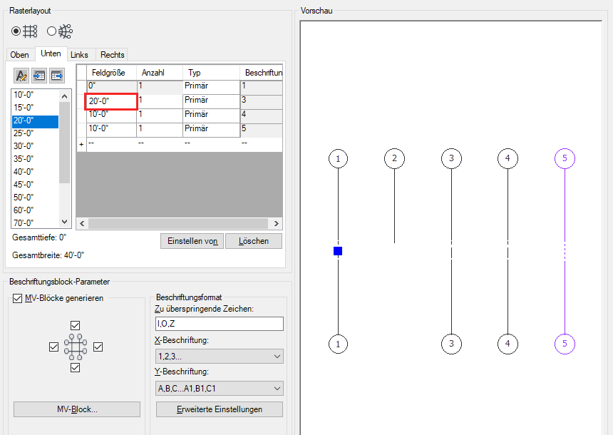 Nun überspannt das erste Feld unten zwei Felder, und Sie haben statt fünf Rasterlinien nur vier. Sie können nun entweder zur Registerkarte Links wechseln, um die Rasterachse zu bearbeiten, oder Sie drücken die EINGABETASTE, um das Raster in der Zeichnung zu platzieren.