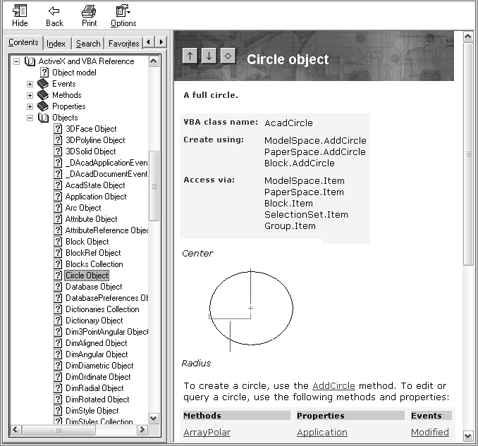 If you do not know what function adds a circle to an AutoCAD drawing, you can figure it out by looking in the ActiveX and VBA Reference. If you look up the definition for a Circle object, here's what the entry looks like: