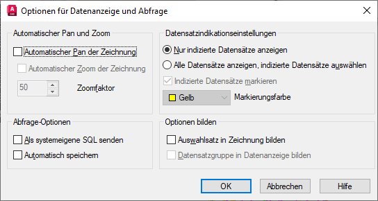 Eine Beschreibung aller verfügbaren Optionen finden Sie in der Befehlsreferenz unter DBVERBINDUNG im Dialogfeld Optionen für Datenanzeige und Abfrage.