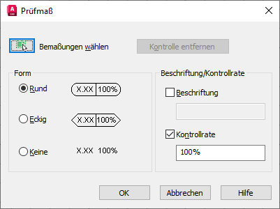 Verwenden Sie die Einstellungen für Form und Prüfbezeichnung/Kontrollrate, um die Darstellung des Rahmens für das Prüfmaß und den Wert für die Kontrollrate festzulegen.