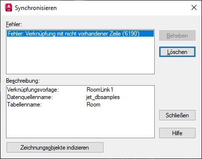 Das Dialogfeld Synchronisieren enthält eine Liste der festgestellten Fehler. Bestimmte Fehler (beispielsweise die Änderung der Größe einer Spalte in der Quelldatenbanktabelle) können direkt über das Dialogfeld Synchronisieren behoben werden. Andere Fehler, wie zum Beispiel Verknüpfungen, die auf nicht vorhandene Datensätze verweisen, müssen in der Quelldatenbanktabelle korrigiert werden.