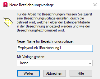 In bestimmten Fällen müssen Bezeichnungsvorlagen bearbeitet werden. Beispiel: Sie möchten zusätzliche Felder aus der Datenbanktabelle in der Zeichnung anzeigen oder die Schrift oder die Größe des Bezeichnungsobjekts ändern. Darüber hinaus können Sie mehrere Einstellungen für den Abstand festlegen, die sich auf den Einfügepunkt der Bezeichnungen und - bei zugeordneten Bezeichnungen - auf die zugehörigen Führungsobjekte auswirken.
