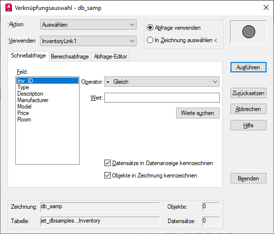Führt die aktuelle Abfrage aus der Verknüpfungsauswahl aus oder schließt das Dialogfeld Verknüpfungsauswahl vorübergehend, sodass Sie grafische Objekte aus der Zeichnung auswählen können. Wenn die Option Abfrage verwenden aktiviert ist, wird die Schaltfläche Ausführen angezeigt. Wenn die Option In Zeichnung auswählen ausgewählt wurde, wird die Schaltfläche Auswählen angezeigt. Nach Auswahl der Schaltfläche Ausführen oder Auswählen können Sie weitere Abfragen anwenden oder zusätzliche grafische Objekte in den Auswahlsatz aufnehmen.