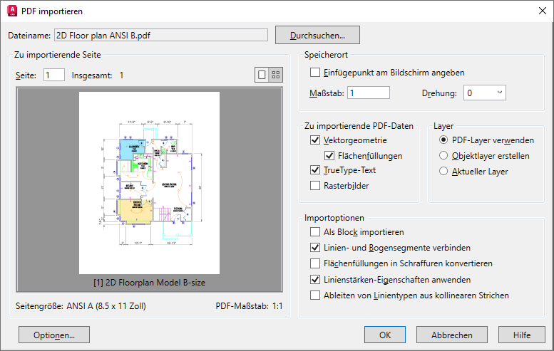 Sie können einen anderen Import-Skalierungsfaktor für die importierten Objekte angeben. Beim Importieren einer Seite aus einer PDF-Datei wird nicht die Einstellung der Systemvariable INSUNITS verwendet, da jede Seite eine unterschiedliche Skalierung haben kann.
