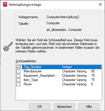 Zeigt alle Felder an, die für die aktuelle Datenbanktabelle zur Verfügung stehen, außerdem den Feldtyp sowie (bei alphanumerischen Feldern) die Feldlänge. Um ein Schlüsselfeld für die Verknüpfungsvorlage festzulegen, aktivieren Sie das Kontrollkästchen links neben dem gewünschten Feldnamen.