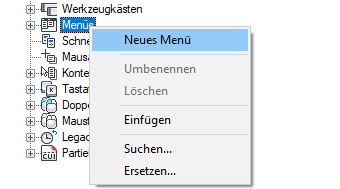 Klicken Sie auf der Registerkarte Anpassen im Bereich Anpassungen in <Dateiname> mit der rechten Maustaste auf den Knoten Menüs. Klicken Sie auf Neues Menü.