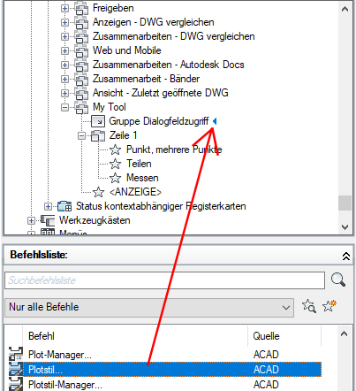 - Ziehen Sie einen Befehl aus der Befehlsliste auf die Option Gruppe Dialogfeldzugriff in der Gruppe.