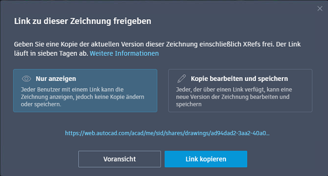 FREIGEBEN stellt die Datei und alle zugehörigen Referenzen als URL bereit, die in der AutoCAD-Web-App geöffnet werden kann. Jeder Benutzer mit dem Link kann die Zeichnung im Internet öffnen. Der Link läuft nach sieben Tagen ab.