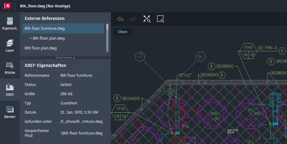 Zeichnungen mit der Bezeichnung Nur anzeigen sind schreibgeschützt, und Sie werden feststellen, dass die Werkzeuge Speichern, Plotten und Zeichnen deaktiviert wurden. Wenn die Zeichnung mit Bearbeitungs- und Speicherberechtigungen freigegeben wurde und der Benutzer die Zeichnung an einem bestimmten Speicherort speichert, werden alle der Zeichnung zugeordneten Referenzen an diesem Speicherort gespeichert.