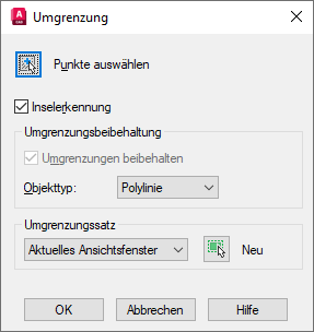 Das Dialogfeld Umgrenzung wird mit mehreren Optionen angezeigt. Die Vorgabeeinstellungen sind in den meisten Fällen optimal. Vergewissern Sie sich, dass der Objekttyp auf Polylinie festgelegt ist.