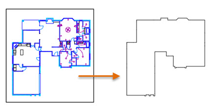 Als Nächstes verwenden wir eine Methode zum Erstellen einer geschlossenen Polylinie um einen Satz von Objekten herum. Beispiel: Der Fundamentplan für dieses Wohngebäude wurde erzeugt, indem einfach ein Rechteck um den Stockwerksgrundriss erstellt wurde, und zwar durch den Befehl Umgrenzung und das anschließende Löschen der nicht benötigten Geometrie.