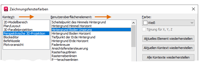 Anmerkung: Um schnell zu den vorgegebenen Farbeinstellungen zurückzukehren, öffnen Sie das Dialogfeld Zeichnungsfensterfarben und klicken auf Alle Kontexte wiederherstellen auf der rechten Seite des Dialogfelds Zeichnungsfensterfarben.
