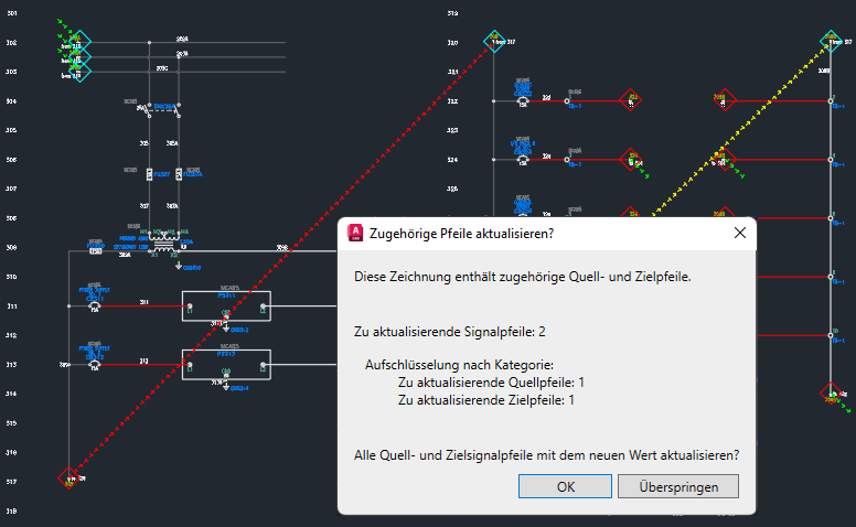 Jetzt werden alle Quell- und Zielpfeile mit der gleichen Signalbezeichnung in einer Zeichnung aktualisiert, wenn die Signalbezeichnung in einem der Quellpfeile aktualisiert wird.