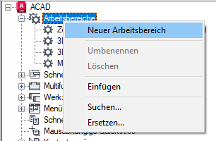 Aktivieren Sie einen Arbeitsbereich, erstellen oder ändern Sie einen Arbeitsbereich, und importieren Sie einen Arbeitsbereich aus einer partiellen CUIx-Datei in die Haupt-CUIx-Datei.