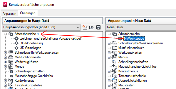 4. Ziehen Sie im Bereich Anpassungen in <Dateiname> (rechte Seite) den Arbeitsbereich aus der CUIx-Datei auf den Knoten Arbeitsbereiche der Haupt-CUIx-Datei im Bereich Anpassungen in <Dateiname> (linke Seite).