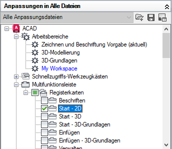 2. Klicken Sie auf der Registerkarte Anpassen im Bereich Anpassungen in <Dateiname> auf das Pluszeichen (+) neben dem Knoten Arbeitsbereiche, um ihn zu erweitern.