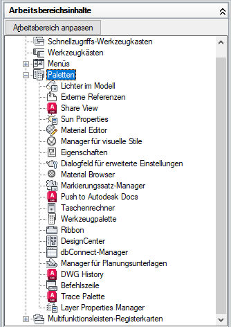 - Klicken Sie im Bereich Arbeitsbereichsinhalte auf das Pluszeichen (+) neben dem Knoten Paletten, um ihn zu erweitern.
