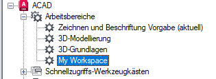 - Klicken Sie auf der Registerkarte Anpassen im Bereich Anpassungen in <Dateiname> auf das Pluszeichen (+) neben dem Knoten Arbeitsbereiche, um ihn zu erweitern.