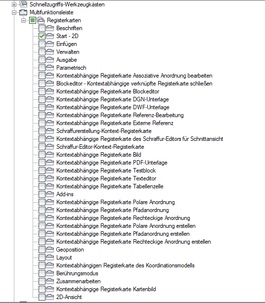 - Aktivieren Sie das Kontrollkästchen neben den Multifunktionsleisten-Registerkarten, die Sie zu einem Arbeitsbereich hinzufügen möchten.
