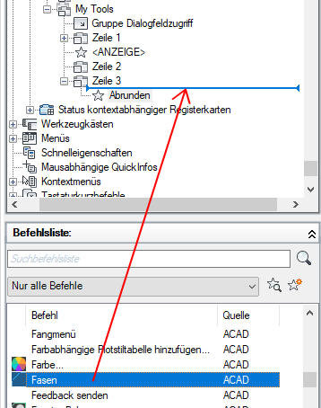 - Ziehen Sie einen Befehl aus der Befehlsliste in eine Zeile, eine untergeordnete Gruppe oder ein Dropdown-Menü der Gruppe.