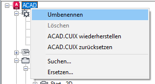Anmerkung: Bei dieser Methode zur Erstellung einer neuen CUIx-Datei kann zusätzliche Arbeit anfallen, wenn nicht alle Befehle und Benutzeroberflächenelemente in der kopierten CUIx-Datei verwendet werden sollen.