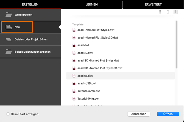 Klicken Sie nach dem Starten von AutoCAD auf dem Begrüßungsbildschirm auf Registerkarte Erstellen > Neu > Öffnen, um eine neue Zeichnung zu beginnen.