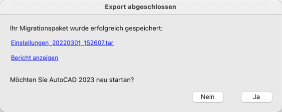 Das Dienstprogramm erstellt eine ZIP-Datei mit den exportierten benutzerdefinierten Einstellungen und Dateien, die Sie dann auf einem anderen Computer importieren können. Auf jedem Computer muss die gleiche Version von AutoCAD oder AutoCAD LT ausgeführt werden.