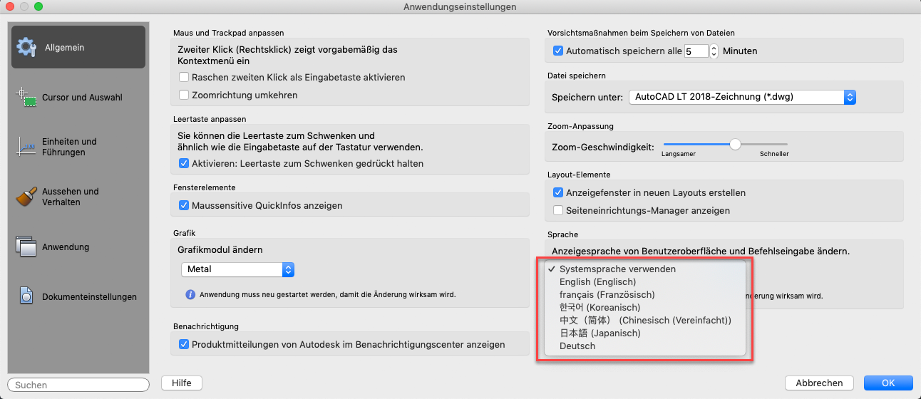 AutoCAD LT for Mac unterstützt jetzt Deutsch und Japanisch. Sie können die Sprache im Dialogfeld Anwendungseinstellungen ändern. Starten Sie AutoCAD LT for Mac neu, damit die Sprache geändert wird.