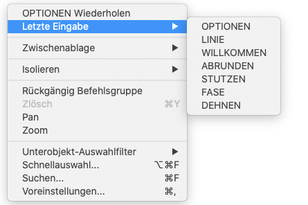 Letzte Eingabe ist nun im Kontextmenü verfügbar. Wenn kein Befehl aktiv ist, enthält das Menü Letzte Eingabe die zuletzt verwendeten Befehle. Wenn ein Befehl aktiv ist, enthält das Menü die neuesten Koordinaten.