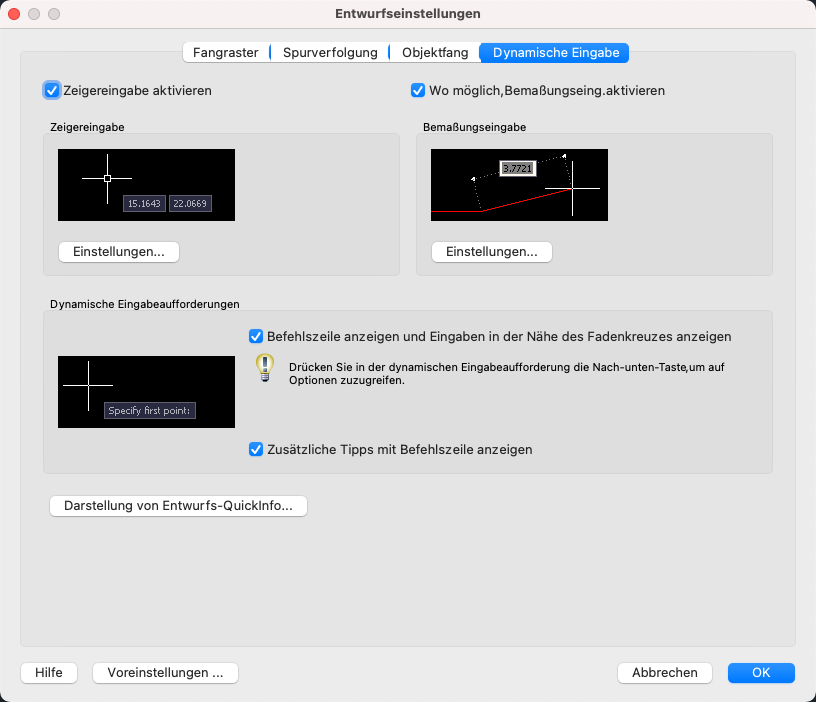 Steuert die Zeigereingabe, die Bemaßungseingabe, die dynamische Eingabeaufforderung und die Anzeige von QuickInfos der Zeichnungen.