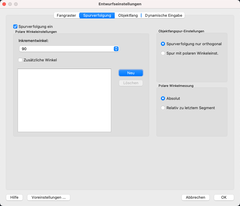 Wendet die Spurverfolgungseinstellungen in Objektfangspuren an. Wenn Sie Objektfangspuren verwenden, verfolgt der Cursor die Spur entlang der Ausrichtungswinkel von aufgerufenen Objektfangpunkten. (Systemvariable POLARMODE)