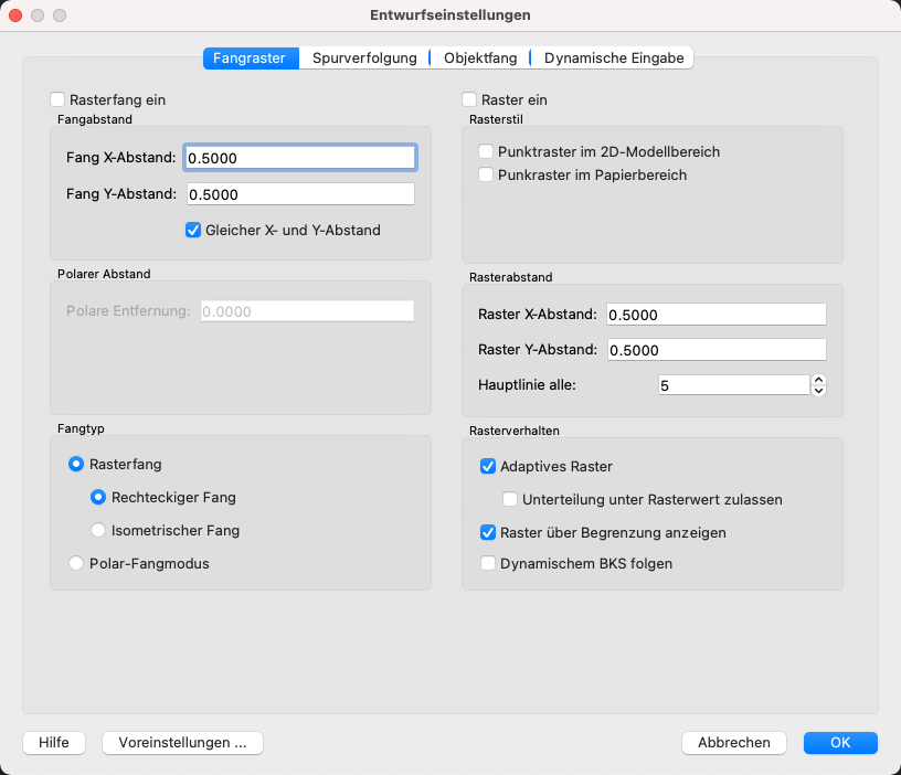 Legt Einstellungen für Fang und Raster fest.