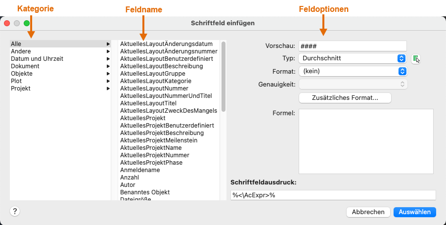 Wählen Sie im Dialogfeld Schriftfeld einfügen eine Kategorie und einen Schriftfeldnamen.