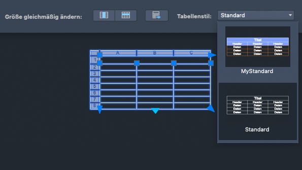 In der Tabellenleiste werden Miniaturansichten für jeden Tabellenstil angezeigt.